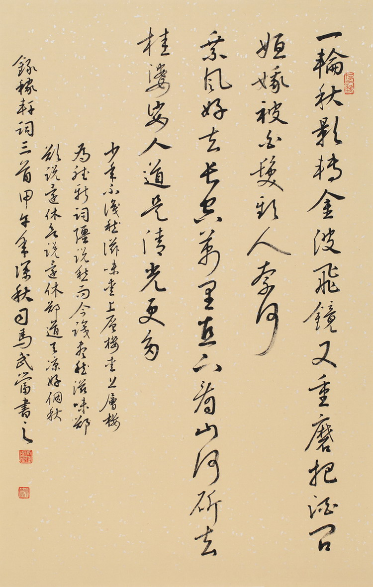 司马的书法,尽管横向接纳元素相当丰富,但其作品非为对他人描摹拼凑,而是他自己个性符号实现。笔者愚见,表现为以下几个方面:法度严谨,在守法破法之间,绝无虚妄和无病呻吟的胡来;情绪潇散淡泊,空明清朗;线条“写”性流畅,节律动静斯守,变势轻松文静;经营气发有度,起承转合有序,呼应关照有因等等。这使笔者想到,当下一些书法家提出所谓:创新就要“现代”,就要敢于“否定”过去,就要“前卫”,敢于“行为”等口号对传统书法基因传承的蔑视。我们必须清楚,中国书法作为中国文化本体性生长起来的艺术奇葩,是有其民族文化“基因”的,任何艺术,尽管都是当时代的艺术,是求“异”的结果,但它必须是在存“同”前提下的“求异”结果,否则就变种异化了。