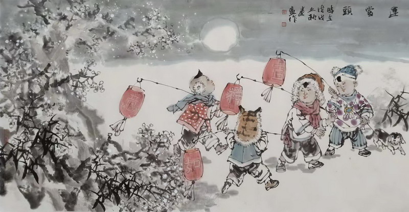 姚建广的童子画别具自己的风格特色,用现代的手法展现传统的童子题材,将现代审美与传统民俗有机结合,画面动静适宜,人物呼应,活泼清新。扎实的造型功力,使他善于在动态中表现儿童的个性和趣味。