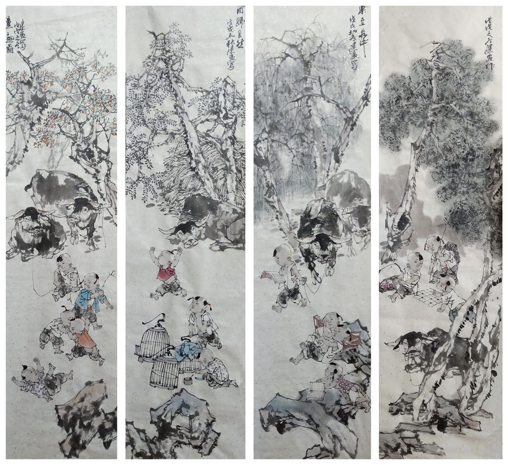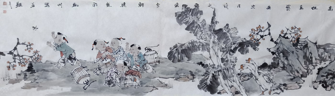 一幅《童真雅趣》,在摇曳的芭蕉树旁,几个孩童正在玩琴棋书画。画面繁密疏朗有致,人物形象的刻画丰富而细致,有的伏在桌面,全神贯注地写画,有的聚在一起棋弈,认真而投入。扎着小辫,虎头虎脑,神情俏皮可爱,着装朴实有趣。的确让观者感受到了一种童真与雅趣,富有艺术感染力。《展翅高飞》,则以单纯、精练、朴素的艺术语言,描绘出孩童放风筝的景象,以自然景物做衬托,人物穿插其间,青青的草地,飞翔的风筝,一群可爱的孩童,或坐下,或仰望,或飞奔,和谐共处,其乐融融,似有欢声笑语入耳帘。整幅作品色彩古朴,着墨浓淡适宜,洋溢着浓郁的童真气息,也体现了作者对儿童生活观察的细致入微。