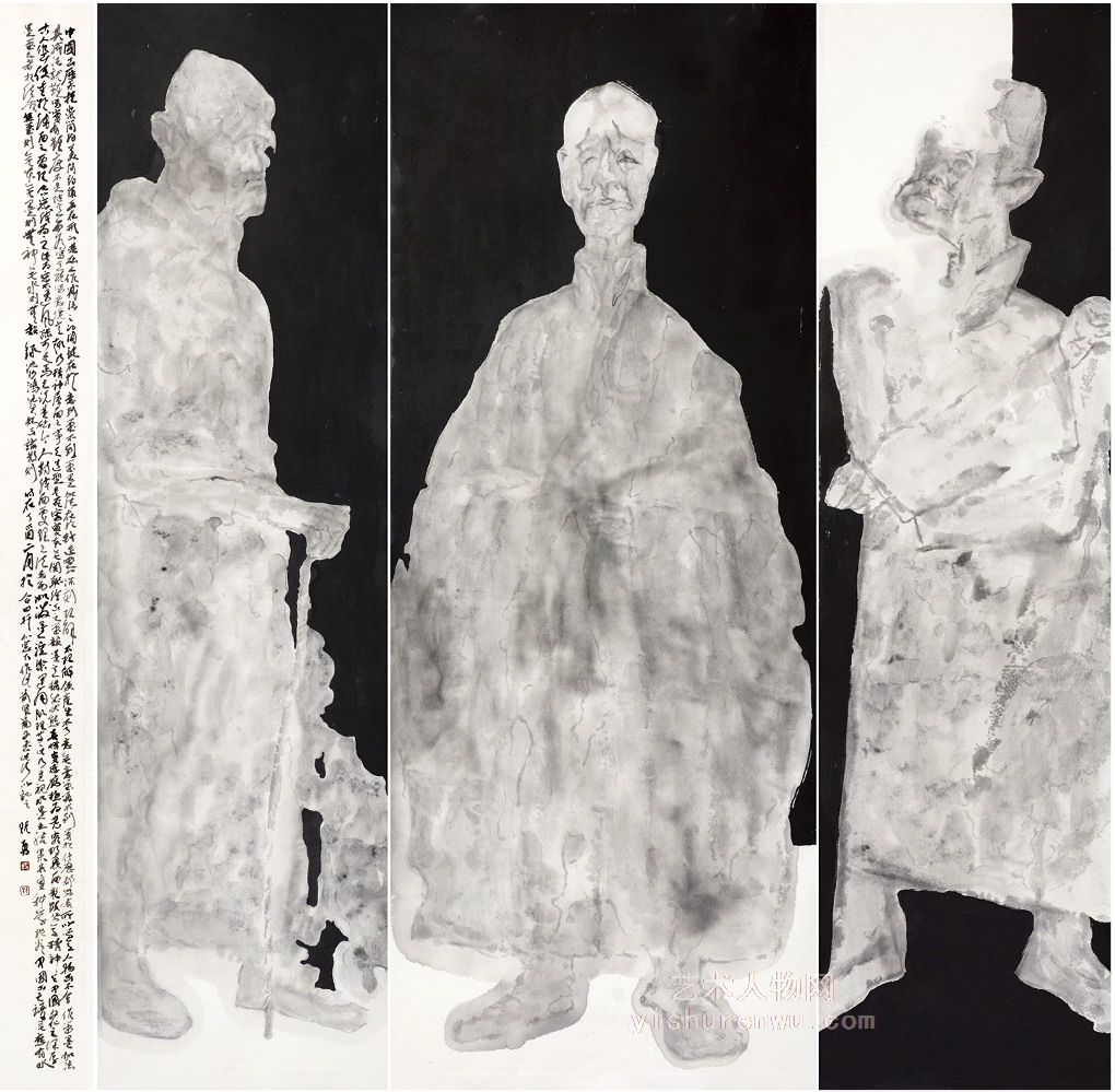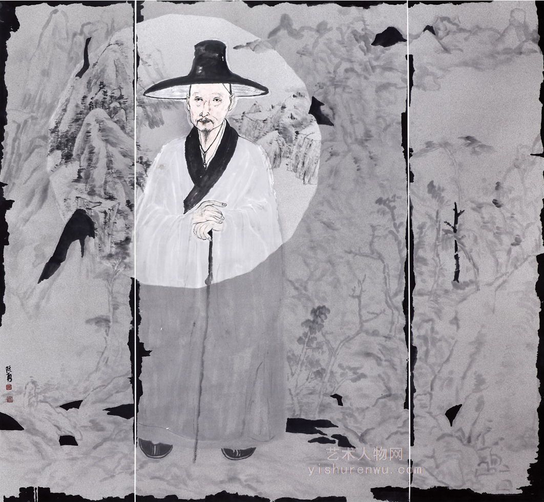他的单体人物画,多表现古贤,这种艺术探索,是他的审美趣旨所决定的,因此,在这类艺术表现之中,他注重渲染被表现人物的一种内在文化品味,从而达到他对人物形象的构建。他按照自己对传统文化的理解,来探讨古代贤圣的外在风貌和内涵魅力。这种人物表现是极为费功夫的,要慢慢地揣度,推敲,品味。只有经过一番穿越时空的对古贤的拜访和瞻仰式的对话,才能和古贤有心灵上的靠近,才能对古贤的形象表现的丰满、细腻和鲜活。阮勇显然做得了这一点并且有独到的心灵感悟。比如他的绘画艺术作品《八大山人》就不是以往画家笔下的那种睥睨傲岸、冷漠孤独的高士形象,而是一种和蔼可亲、平易近人的现代长者,这种表现方法,从意境上说就有了时代性,从表现方法上看,就有了一种质的突破。这就是我手写我心的一种典范。照这个路子走下去,阮勇的视野会越来越宽阔,成就会越来越大,前途一定不可限量。这种独立地思考,独立地发掘,用独立地笔墨语言表 现的方法,正是这个时代所需要的艺术。