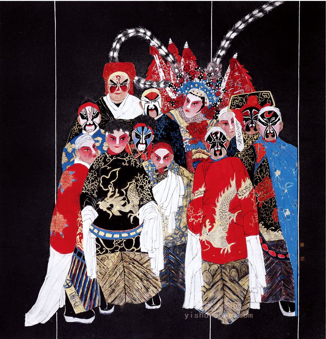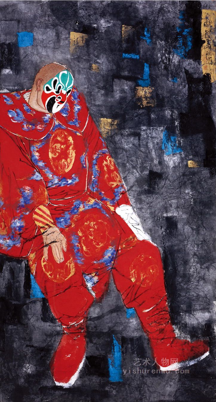 阮勇的人物画有两种表现方法,一是忠于原型的写实,一是靠妙思想象的写意。前者如《芦笙梦》《孔明管奏和谐梦》《八大山人》等,后者如《戏外》《钟馗》等。不管是写实的人物,抑或是写意的人物,都是以形写神,通过优美流畅的线条,适宜的色彩,表达人物的内心精神世界和品格。他的人物造型娴熟、章法布局协调舒展,各种物像呼应得当。