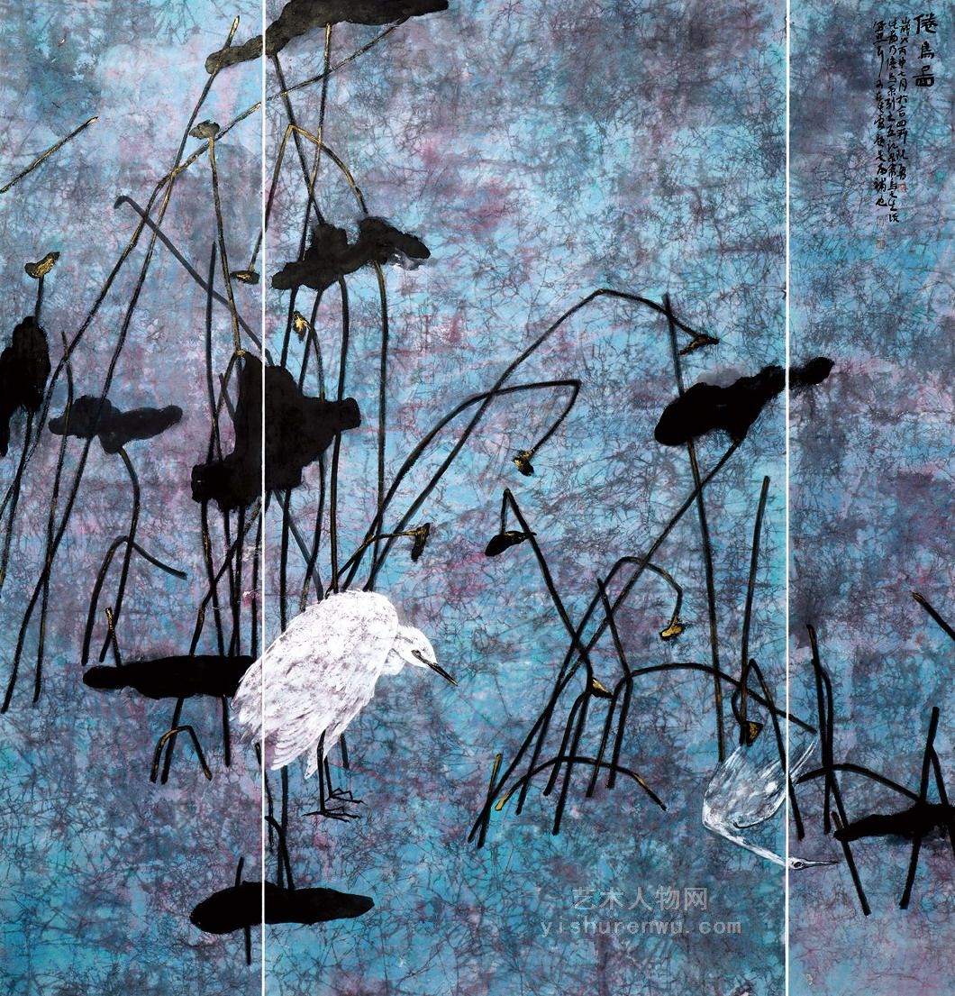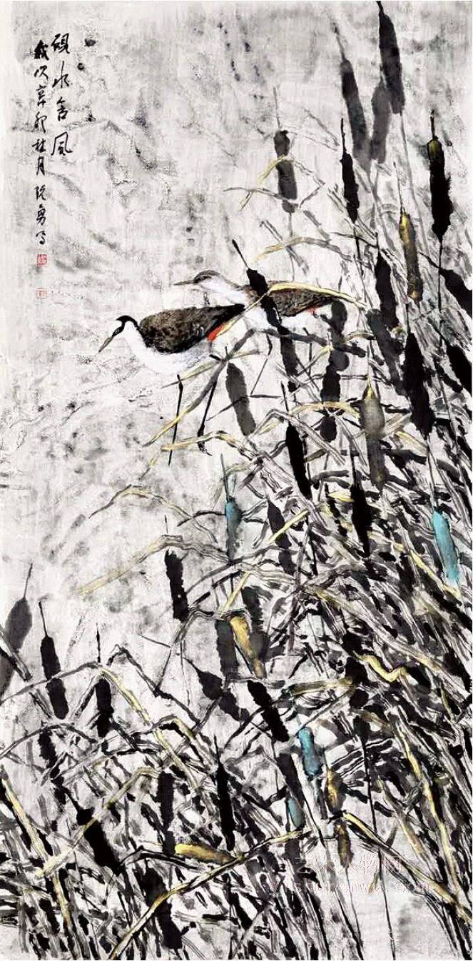阮勇花鸟画。阮勇花鸟有瑰丽清雅,明艳多趣,简洁深寓之特点。观阮勇花鸟,一花一叶,一鸟一树,工细之中饱含灵动,严谨之中饱含放逸,色彩华而不腻,厚重而不浊,热烈而温润,视觉冲击力强而不抢眼,对比明显但过度的极有节奏。他的花鸟画常用拟人法,重趣味的表达,这是他注重观察、勤于思考的缘故。比如:绘画艺术作品《微风摇紫叶》之中,左边一株紫叶,婀娜多姿,屈曲下垂,右边一只白鹤回头谛视。在视觉形象上,一紫一白,对比成趣。细品,意趣盎然。再如,绘画艺术作品《乙亥十月》之中,一鸟缩头立于孤枝之上,白眼注目蓝叶素花,情态可人,极富诗意。