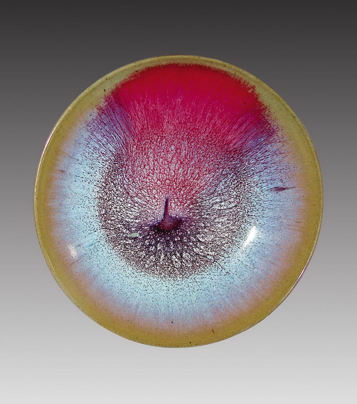 《凤凰涅槃》钧盘,任星航作品,手工拉坯成型,柴窑烧制。直径约9寸,高2寸,做工精细,式样古朴,口沿处破釉而出,微露胎质,形成了完整的铜口铁足。窑变釉色,一边青中见白,闪耀着乳玉般的光泽,显示出热烈过后的宁静与沉稳,而另一侧,一凤昂首向前,周身的羽毛清晰可见,尾部艳红一片,形成了“火中飞凤”的壮丽景观,将钧瓷自然窑变艺术推向了极致。