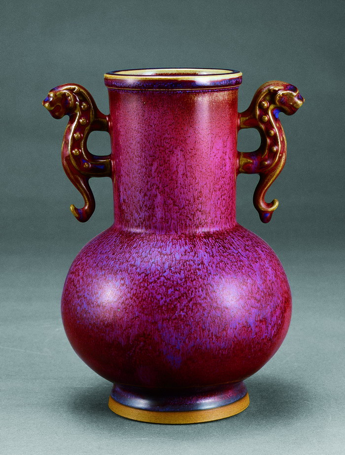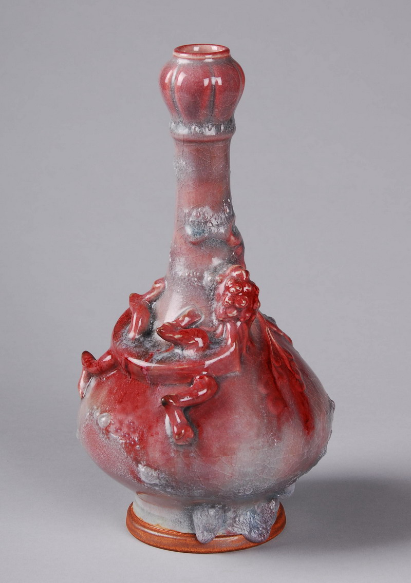 《蟠龙瓶》星航钧瓷公司镇窑之宝,任氏钧瓷世家第七代传人任星航作品,手工拉坯成型,煤窑烧制。口部呈花蕾状,颈部修长,肩腹部浮雕幼龙,形态端庄而不失秀美。窑变釉色奇绝,瓶上初生的幼龙呈淡红色,血脉隐现,极具肉感,呈现出生命的鲜活和灵动,而幼龙上方左右则祥云环绕,云蒸霞蔚,而下方,缕缕血红的水迹则是幼龙脱离母体新生时的血痕,幼龙四周有大大小小吹弹即破的水泡,另生妙景,构成了幼龙出生、等待腾飞的画面,达到了“天人合一”、“神鬼造化”的境界。