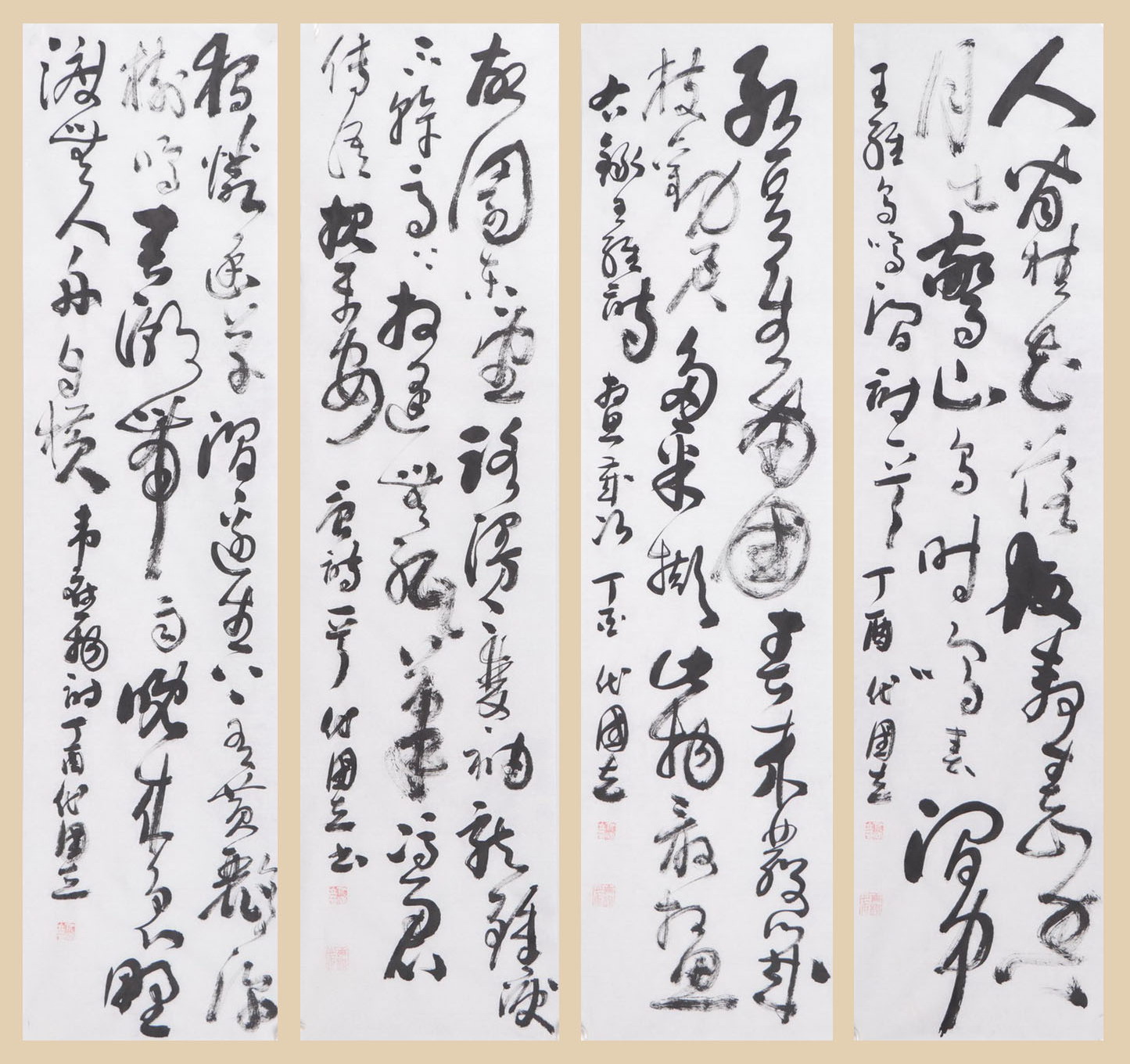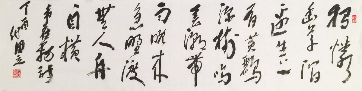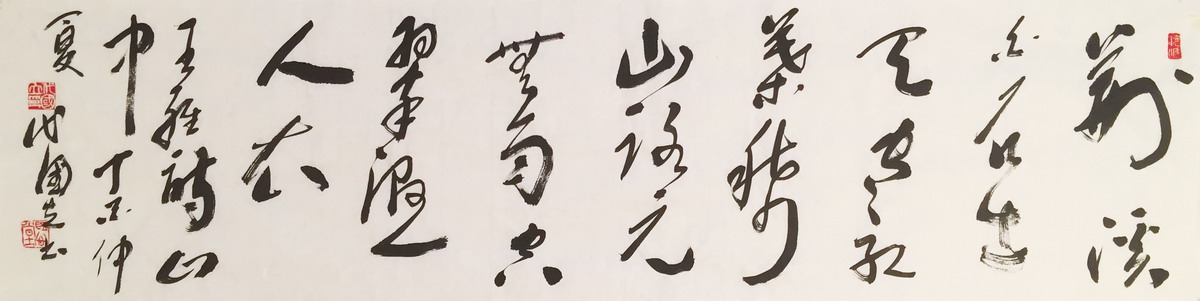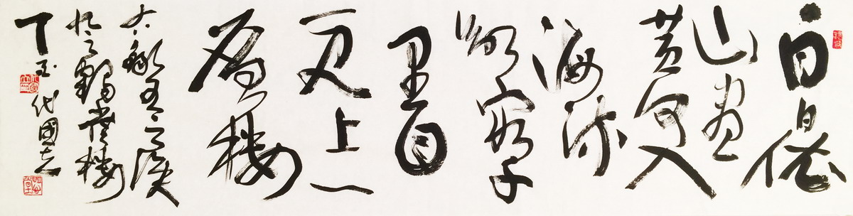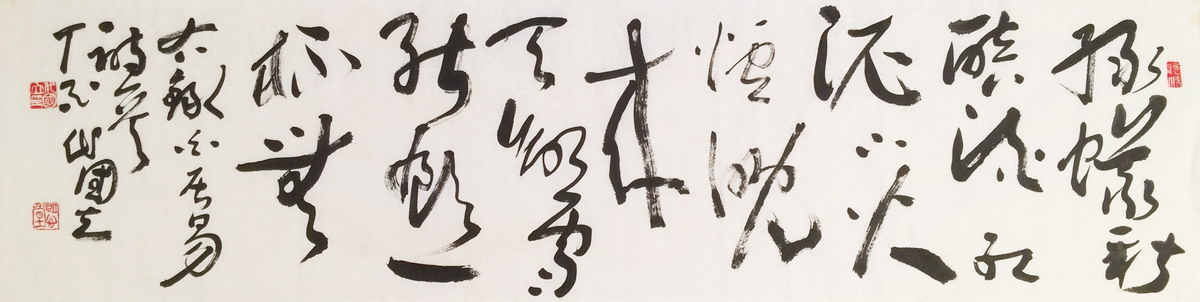 早年曾多次拜访杨公亮先生,受其影响,余始终对草书情有独钟,自认为对孙过庭书谱用功最勤,兼学张芝“二王”、张旭、怀素、祝允明、王铎诸家。数年临池不缀,获得了精神之快乐,对艺术从未奢求有大成,但求我书无媚俗。年已知天命,艺术虽未达天籁之境界,但已有雄浑老辣之状态,岂非快哉?余常以小楷、行书示人,或赠于友人,绝少拿草书出来,此并非抠门儿,吾深知草书之难,其它书体远不能及,任何书体只能是草书之基础,所有艺术元素均可被草书所笑纳,创作不理想者怕不尊重别人,满意的又舍不得,与其两难,索性出此下策。