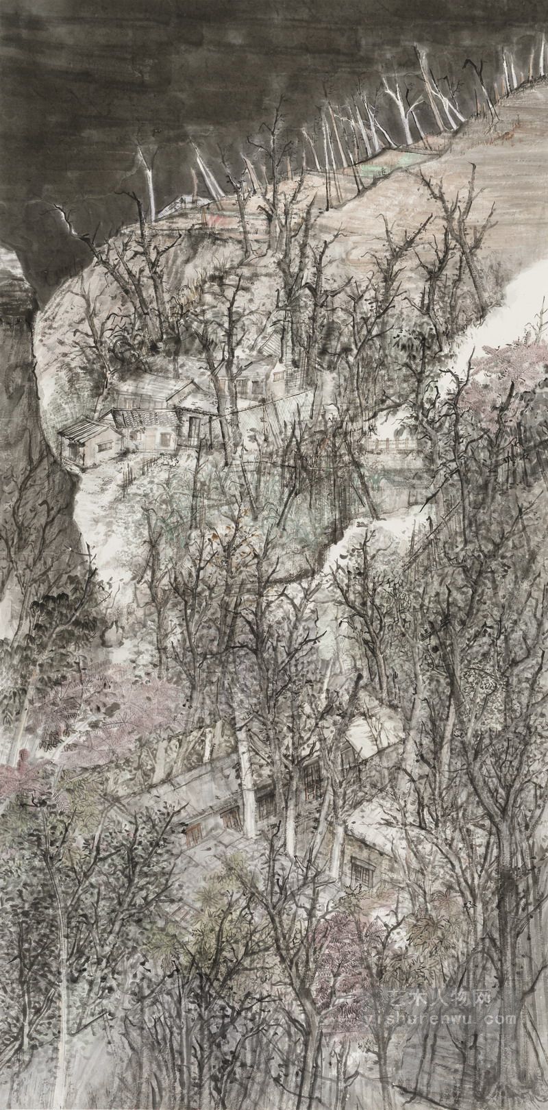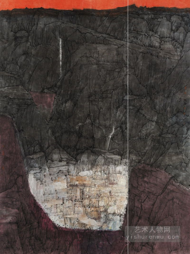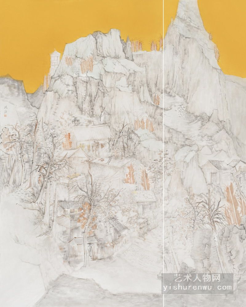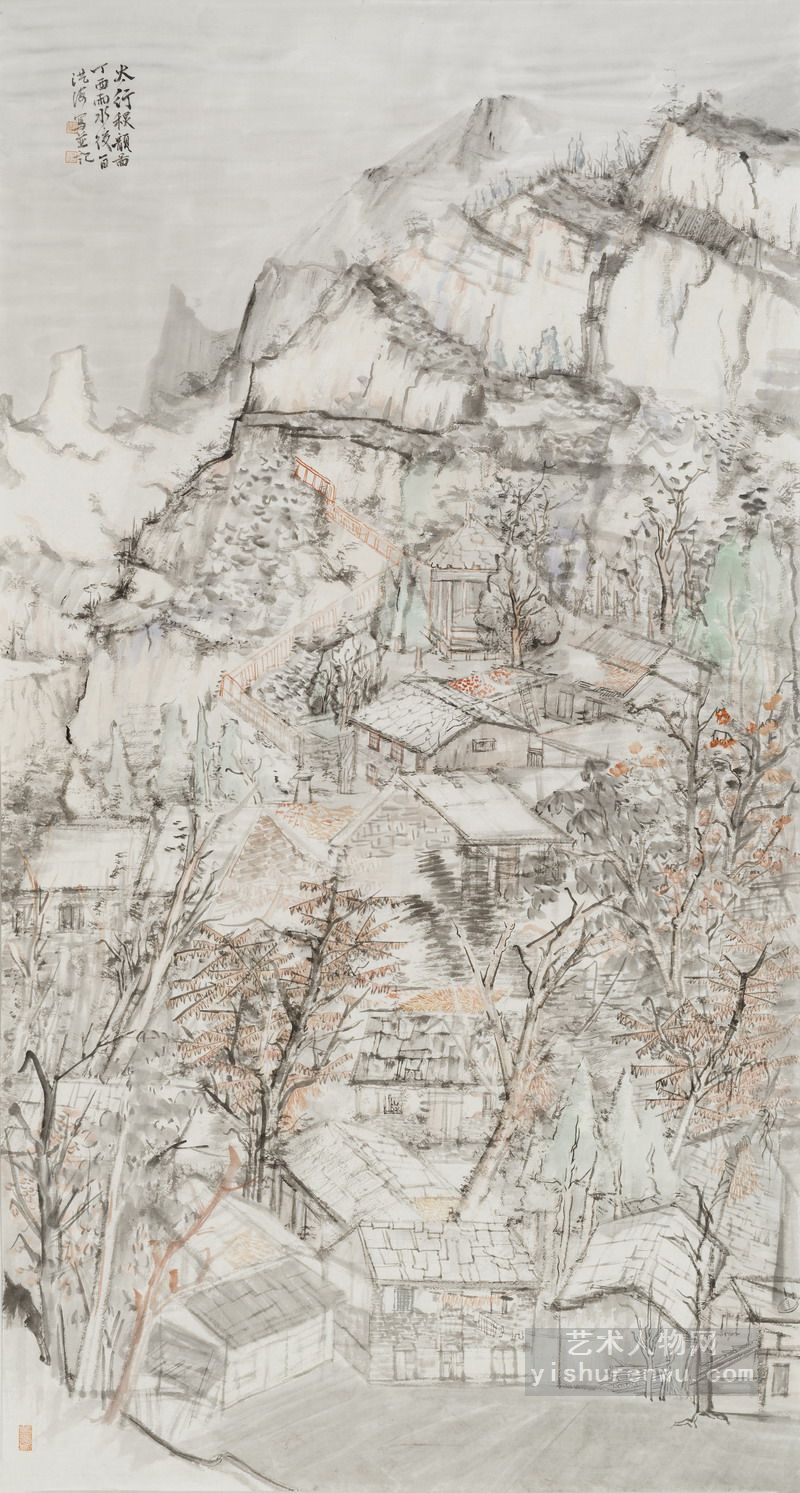 正是有了这些“取精用宏,澄怀味象”的涵养,形成了洪海绘画朴实内向,注重精神实质刻画的画风。他的画往往丘壑纵横,高屋建瓴,主峰突兀,气势磅礴。“大山堂堂为众山之主,所以分布以次冈阜林壑为远近大小之宗主也。其象若大君赫然当阳而百辟奔走朝会,无偃蹇背却之势也。”(郭思《林泉高致集》)他的画有北宋山水画的大场景,大开合,大气势。这种全景式的构图是历代山水画家所追求的,正如沈周有《庐山高图》,范宽的《雪景寒林图》,郭熙的《早春图》等,这种宏大的场景可能正是洪海心中的图像吧,亦或是他心胸的写照。